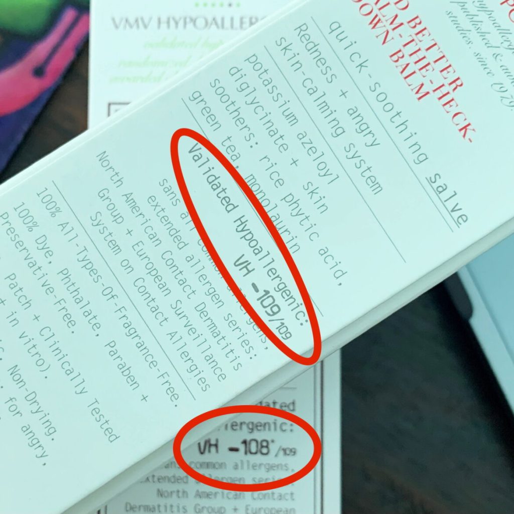 3. The “VH-Number” rating system “grades” a product’s safety based on how many allergens it does not contain, as referenced by the list of allergens compiled by objective, independent institutions like the American Contact Dermatitis Society and European Surveillance System on Contact Allergies. There are now 109 top allergens that are ingredients frequently found in cosmetics, or common cross-reactants/contaminants of cosmetics. VMV’s products are free of most or all 109 allergens, as reflected by the VH rating on the label. Uniquely, VMV continuously reviews studies and reformulates products if even just one ingredient becomes identified as an allergen.