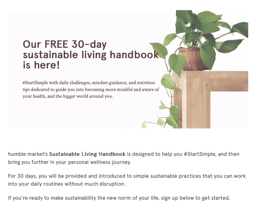 As part of its ‘promo strategy‘ the brand provides a free 30-day sustainable living handbook. It is the brand’s way of building its first-party data of its own wellness community while providing simple “daily challenges, mindset guidance, and nutrition tips dedicated to guide you into becoming more mindful and aware of your health, and the bigger world around you”.