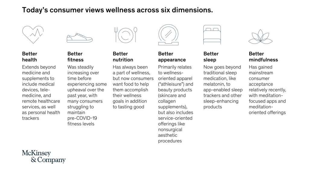 In an April 2021 article, McKinsey and Company wrote: “Our latest research shows that consumers care deeply about wellness—and that their interest is growing. In a survey of roughly 7,500 consumers in six countries, 79 percent of the respondents said they believe that wellness is important, and 42 percent consider it a top priority. In fact, consumers in every market we researched reported a substantial increase in the prioritization of wellness over the past two to three years. We estimate the global wellness market at more than $1.5 trillion, with annual growth of 5 to 10 percent.”