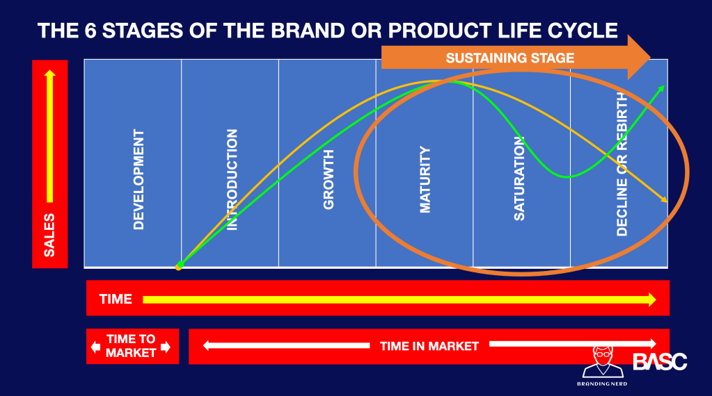 The last three cycles, Maturity x Saturation x Decline or Rebirth, are what I refer to as the ‘Sustaining Stage‘. A brand’s behavior during the three cycles of its sustaining stage will determine its fate during the the sixth cycle.